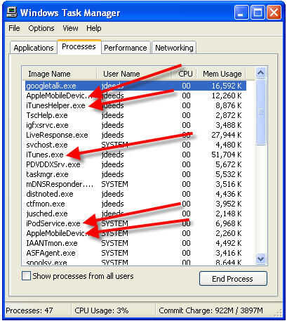 Cuando estás en el aspecto de la ficha de procesos a ver si alguno de los siguientes procesos se muestran. Poner fin a todos estos procesos. Una vez que has hecho este espere un par de minutos. Ahora poner en marcha iTunes otra vez. Esto debería corregir el problema. Si todavía no aparece continúe con paso 6.