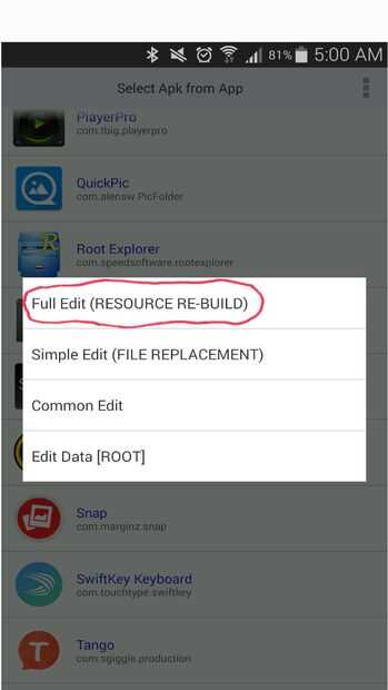 Después de seleccionar la aplicación instalada, en este ejemplo la aplicación smartstart, seleccione Editar completo. La aplicación toda la carga en unos segundos en apk editor pro.