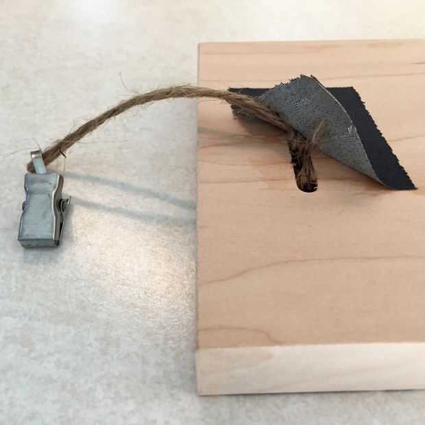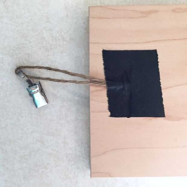 Los cuadros de madera tienen una hendidura donde se colgaría en la pared con un clavo. No funcionaría para este proyecto así que había anuda un pedazo de guita, colocarlo en la ranura y había cubierto con garfio cinta/cinta. Luego añadir un clip al final.