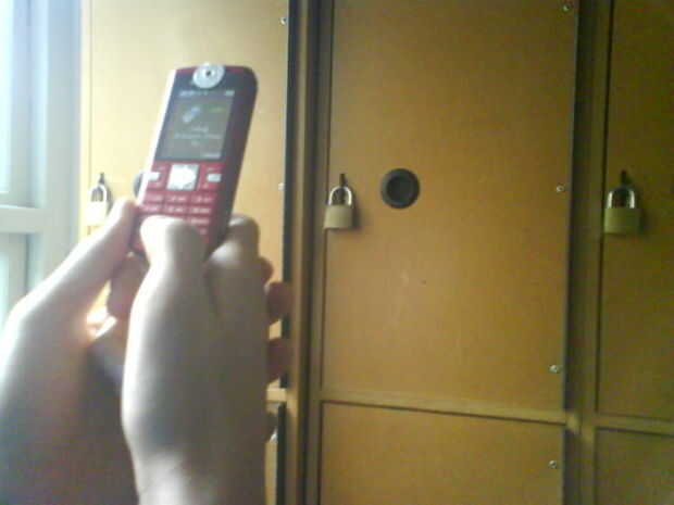 Ir a algún lugar donde usted puede ver el armario, pero no ser visto, como en la puerta de un aula o detrás de una columna. Usando el teléfono de alguien, llame a su teléfono cuando alguien está cerca del armario.