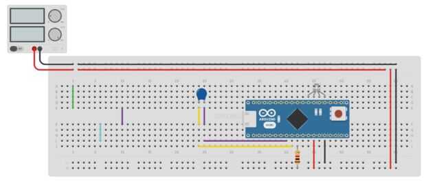 - Pin de 5V de Arduino está conectado en el riel de 5V (en segundo lugar hacia abajo). Este carril de 5V se conecta por el cable rojo a la derecha, en el riel de 5V rojo en la parte superior de tablero.