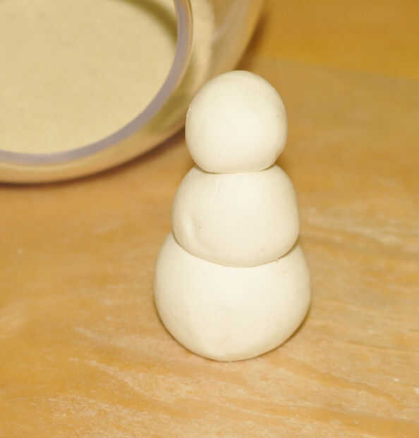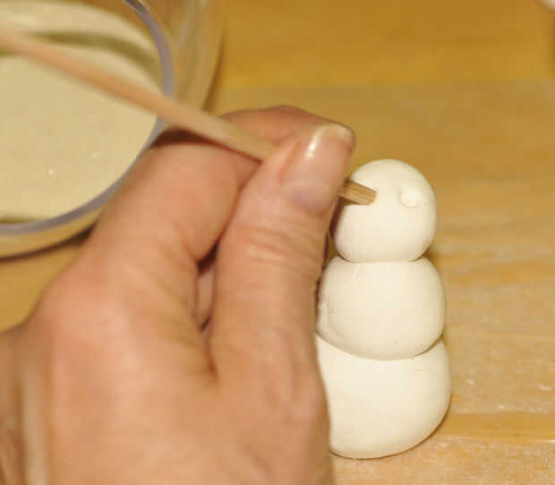 Hacer dos bolas muy pequeñas y prensa los planos para hacer botones. Con el pincho de madera, marque los agujeros para los botones. Humedecer éstos y en media bola.