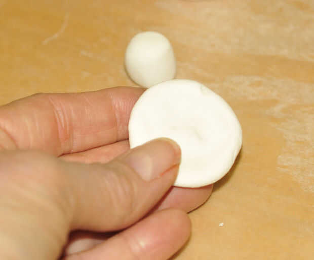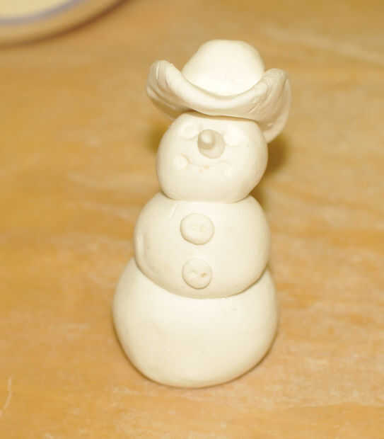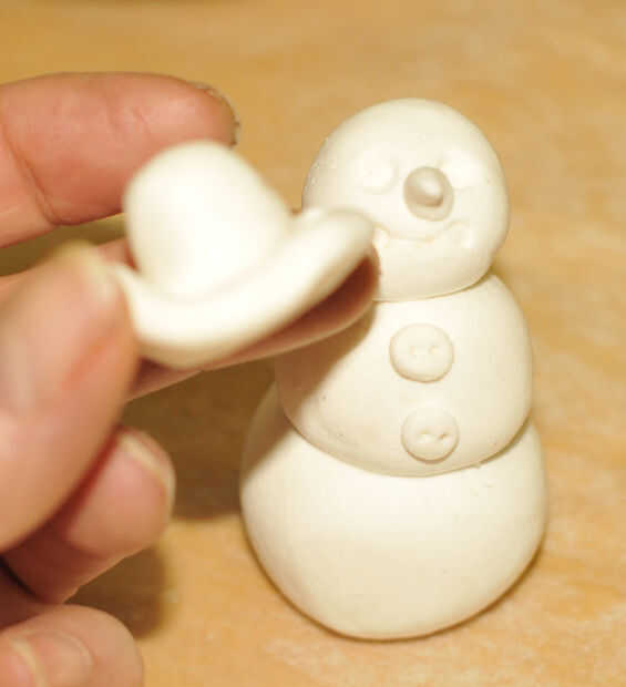 Hacer sombrero del muñeco de nieve rodando por una bola del tamaño de una uva grande y presione con los dedos para que el ala del sombrero. Estirar un pedazo más pequeño de la arcilla y forma en forma de cilindro. Esto humedecer y colocar en el sombrero.