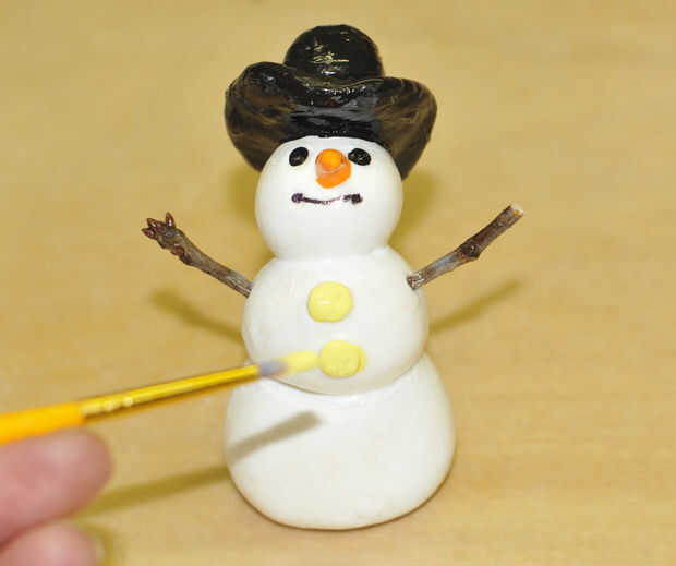 Dejar secar totalmente. Cepillo con Mod Podge y dejar secar. Pinte el sombrero negro, la nariz naranja y los botones de amarillo. Utilice un marcador permanente para dibujar ojos y boca del muñeco de nieve.