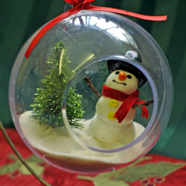 Vierta Décor Sand en la parte inferior del globo en forma de adorno asegurándose de No sobrellene. Coloque cuidadosamente su muñeco de nieve y un árbol de Navidad pequeño dentro el adorno claro.