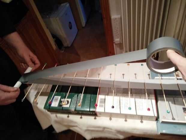 1. Tomar el rollo de cinta y pegue algunos a la segunda palanca. No corte la cinta. Tire el rollo de cinta y ver la primera imagen. Asegúrese de que la máquina de la onda se mantiene bajo tensión para todo el proceso.