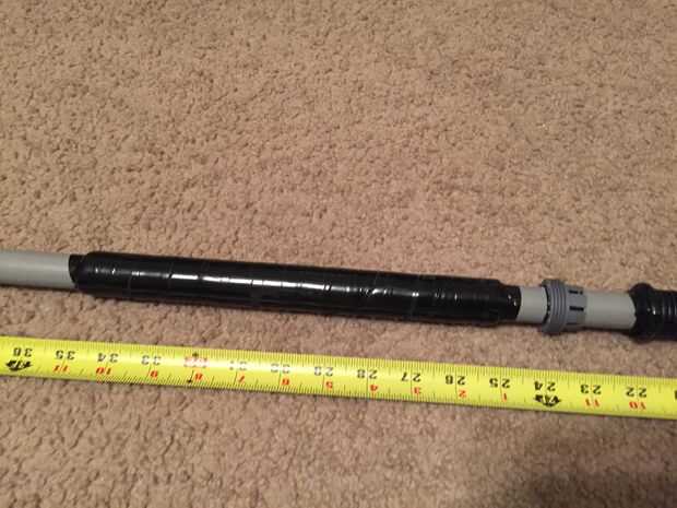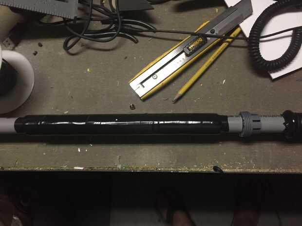 Para la siguiente sección, que corte 9" pieza de espuma de artesanía y envuelto alrededor de la manija, cortar para que envuelve una vez alrededor del eje. Una vez que este había pegado abajo, decidí esto envolver en cinta aislante para sujetar en su lugar como yo lo hice algunas otras piezas. Nuevo tipo de deseo no hubiera hecho esto, pero las cosas resultaron al final. Solo toma más capas de PlastiDip para guardarlo de ser pegajosa.