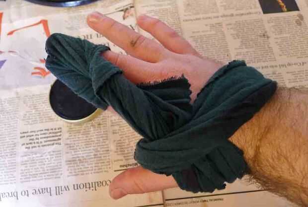 Primero aplicar una pequeña cantidad de pulimento a la tela en la punta de los dedos y empezar a frotar los zapatos con pequeños movimientos circulares para aplicar una fina capa de esmalte a la superficie. Evitar frotar luego aplique agua caliente a la superficie (sólo una sola gota a la vez con uno de los dedos de su mano libre, en mi caso mi izquierda) luego seguir frotando en movimientos circulares pequeños. Esto empieza a dar un brillo profundo brillante ya que lubrica la cera y permite una capa de cera muy suave empezar a ser construido. Aplicar más cera, recordando a frotar en movimientos circulares pequeños, construir la capa de cera, aplicar gotas de agua según sea necesario (no necesita mucha agua, así que gota a gota es mejor-si se aplica demasiada agua el cuero empieza a mojarse y tendrás que esperar a que seque antes de continuar).