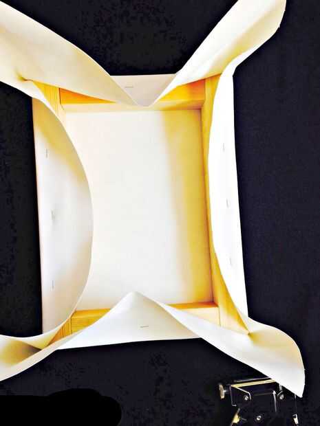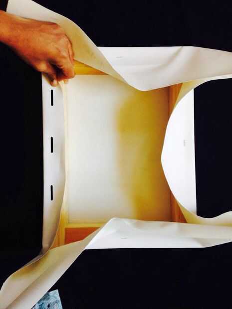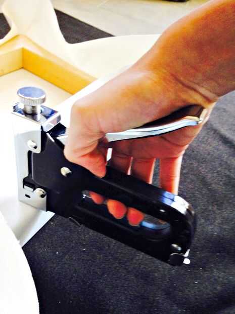 Con una grapa en cada uno de los cuatro bordes, ahora podemos poner una grapa sobre cada 3 pulgadas hacia abajo y alrededor de la parte posterior entera de la lona. Asegúrese de que jale firmemente el material para no arrugarse y el frente será lisa y libre de cualquier arruga.