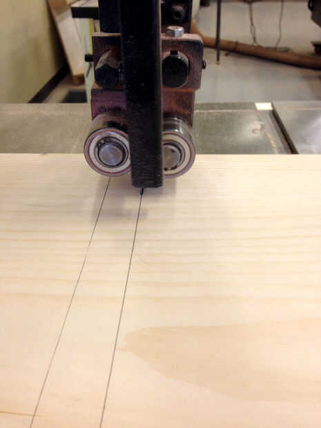 El canal de la marca con un lápiz y utilice una sierra de banda para cortar ranuras por cada lado. Para cortar el tercer lado y permitir que la pieza de madera a extraer, utilicé un pequeño cincel de madera. Esto tenía la ventaja de que me permita agregar un ángulo a esta porción de la cut, como sino contra el frente del vertical en un ángulo de 7,5 grados.