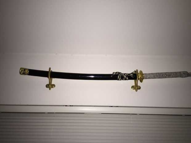 Puede imprimir una katana de un archivo, pero este es metal. Sin embargo, necesitaba una manera de visualizarlo correctamente, así que imprimí los soportes que busca, que están pintados en oro.