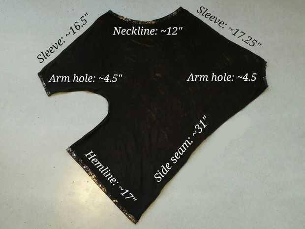 Solo 1 pieza para este DressTop! Esta extraña formada de patrón incluye el escote, los agujeros del brazo y el dobladillo - todo en uno! Estas mediciones son de tamaño pequeño que permite estirar. Sólo se suman una media pulgada todo para cada tamaño.