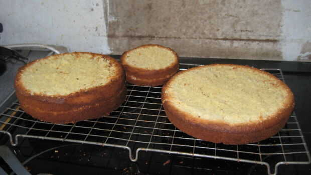 -Cuando hayan enfriado, con cuidado corte las cimas que la parte superior quede nivelada. Usé un cuchillo de cocina de serated larga y un movimiento de sierra.