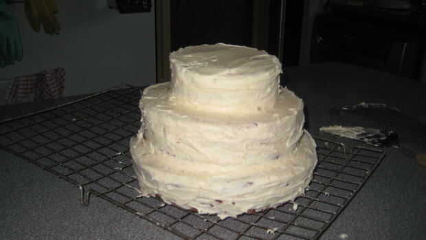 -Una vez que la torta se apila, Dolop la mezcla de crema de mantequilla sobre el superior y se extendía hacia abajo con una espátula. Asegúrese de que hay una capa uniforme que cubre el pastel entero. Esto le dará la fondant/guinda algo a.