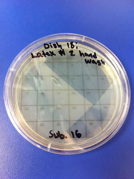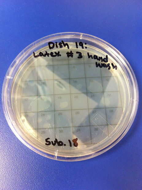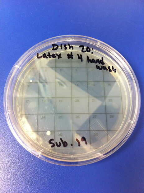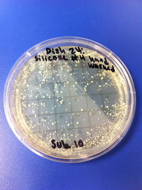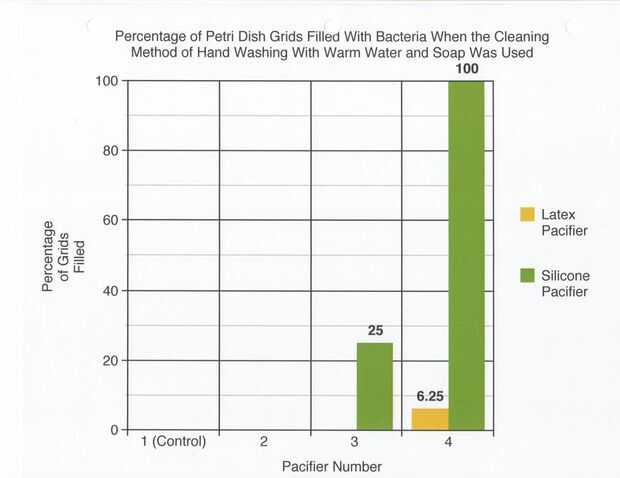 17-20 los ensayos se realizaron utilizando chupetes de látex y el método de limpieza de lavado de manos con jabón y agua tibia. El porcentaje de redes de Petri por colonias (de 32) en el chupete de control fue de 0%. El porcentaje medio de las redes de Petri llenada por las colonias (de 32) en el chupete en el grupo experimental fue de 2.08%. 21-24 los ensayos se realizaron utilizando chupetes de silicona y el método de limpieza de lavado de manos con jabón y agua tibia. El porcentaje de redes de Petri por colonias (de 32) en el chupete de control fue de 0%. El porcentaje medio de las redes de Petri llenada por las colonias (de 32) en el chupete en el grupo experimental fue 41.67%. En general, el porcentaje promedio de redes de Petri por colonias (de 32) en los chupetes de látex fue 19.44% y el porcentaje promedio total de redes de Petri por colonias (de 32) en los chupetes de silicona fue 30.89%.
