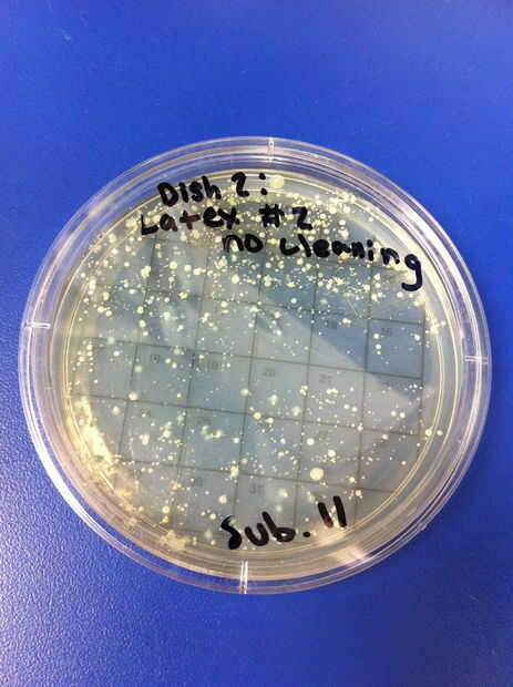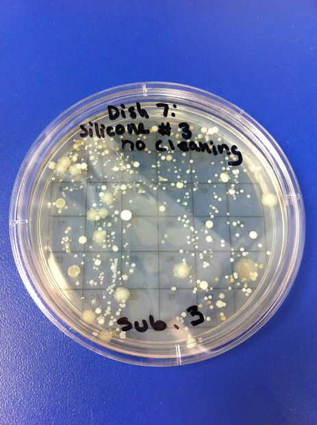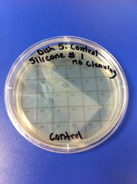 1-4 los ensayos se realizaron utilizando látex chupetes y ningún método de limpieza. El porcentaje de redes de Petri por colonias (de 32) en el chupete de control fue de 6,25%. El porcentaje medio de las redes de Petri llenada por las colonias (de 32) en el chupete en el grupo experimental fue de 56,25%. 5-8 los ensayos se realizaron utilizando chupetes de silicona y ningún método de limpieza. El porcentaje de redes de Petri por colonias (de 32) en el chupete de control fue de 0%. El porcentaje medio de las redes de Petri llenada por las colonias (de 32) en el chupete en el grupo experimental fue de 51.04%.