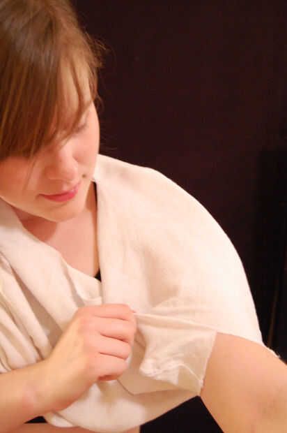 Es probable que usted tendrá que tirar el vestido fuera de su cuerpo para conseguir sus brazos por los orificios. Como tirar el vestido sobre su cabeza, deslice un brazo a través de la sisa. Después de este brazo es totalmente a través, deslizar el otro brazo hacia arriba y a través del orificio.