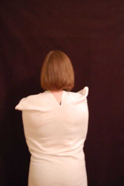 Una vez que la cabeza se adapta cómodamente a través del agujero que ha cortado, tire el resto de la funda hacia abajo alrededor de su cuerpo.