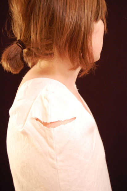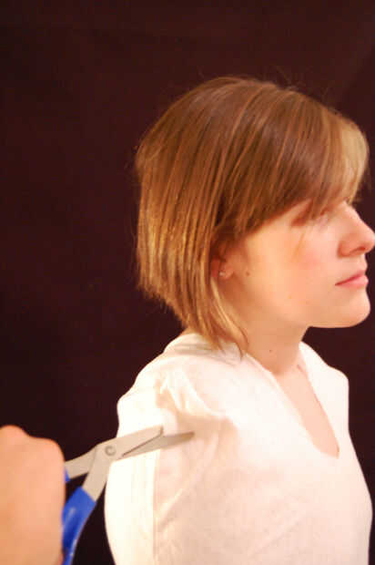 Para cortar los agujeros hacen un corte horizontal de 3 a 4 pulgadas derecho donde la tela se une con la parte superior de su hombro.