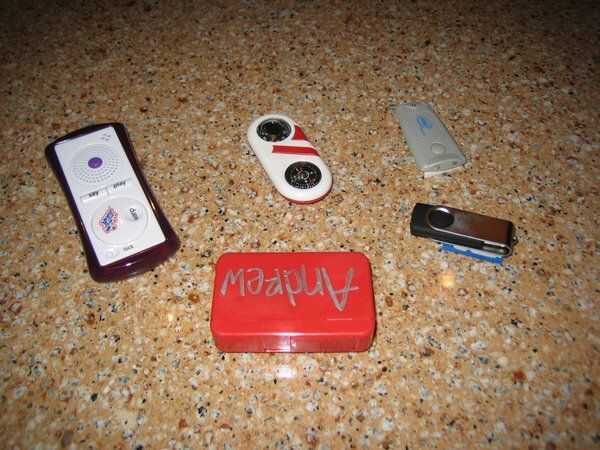 También hemos redondeado un par de accesorios... Un cambiador/grabadora de voz, una brújula, una linterna, una unidad USB y una pequeña caja.
