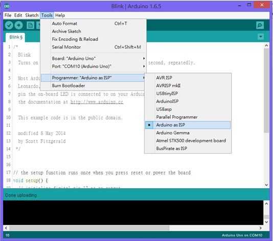 En tercer lugar, seleccione "Arduino como ISP" se utilizará la placa de Arduino Uno como programador.