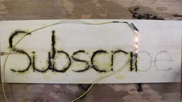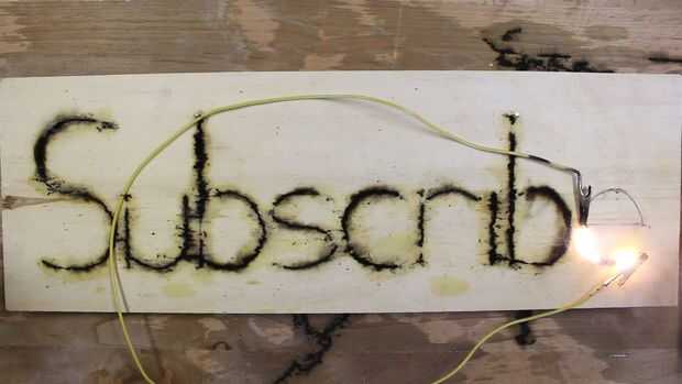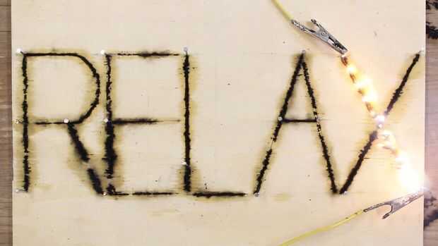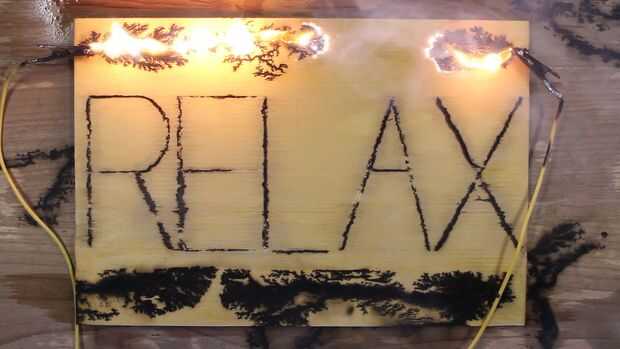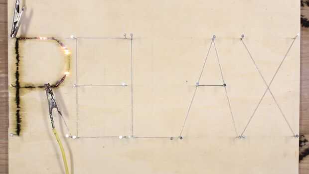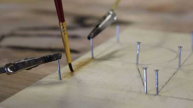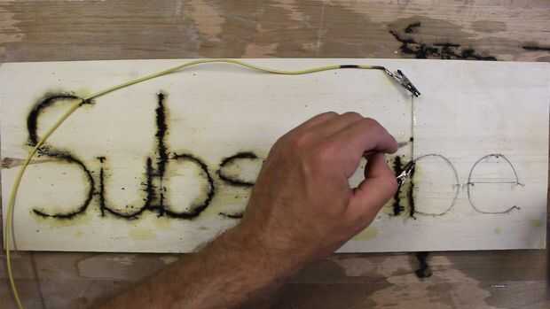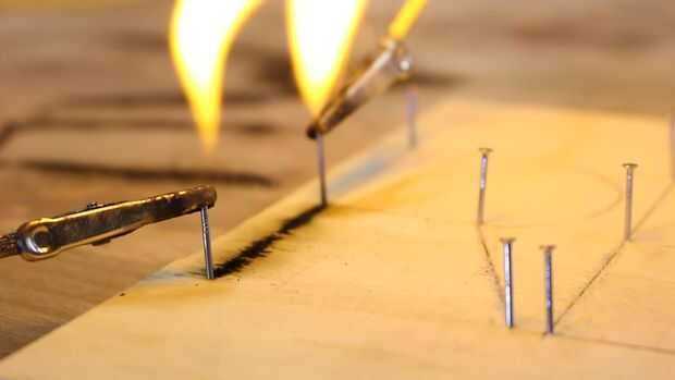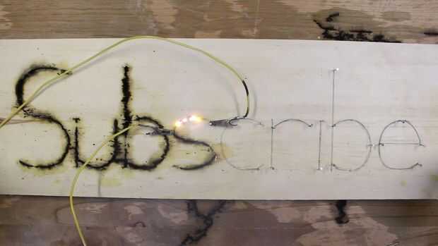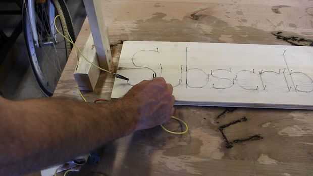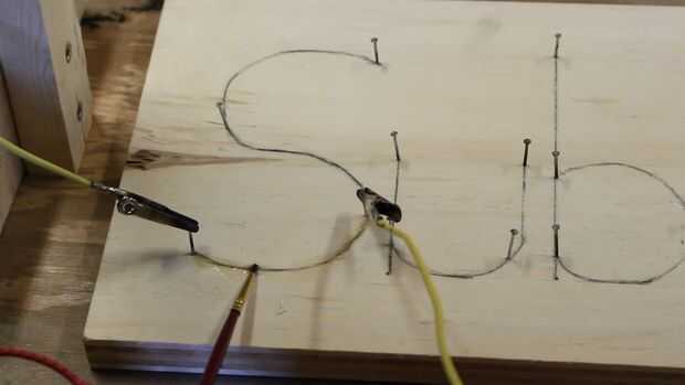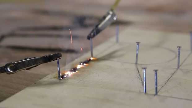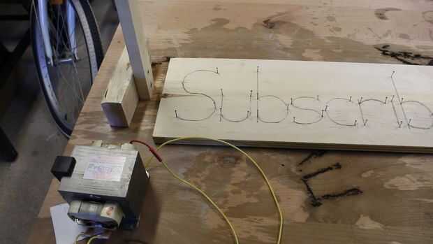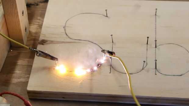 Bueno ahora asegurarse de que el transformador está desconectado, los terminales se pueden enganchar en los dos primeros clavos y algunos de la solución pueden conseguir pintados entre ellos. Ahora Párese mucho a y enchufe el transformador en mantener claro de la madera y el transformador de. La madera comenzará a quemar entre las dos uñas y finalmente se reunirá en poner medio de un arco muy grande. Una vez que sucede este arco el transformador inmediatamente puede ser desconectado y este proceso puede repetirse hasta que termine la palabra. Una vez terminado, incluso puede quemar a lo largo de la parte superior y la parte inferior de la madera para que se vea aún más singular!