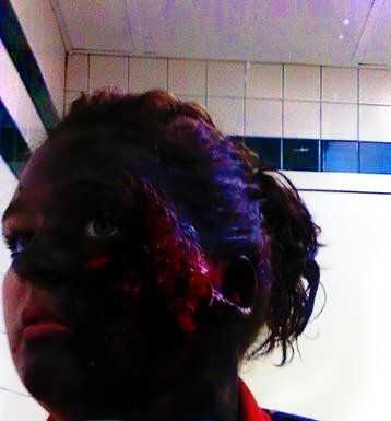 Ahora que se ha secado el látex, aplicarle una fina capa de polvo. He encontrado al maquillaje se adhiera. Usted querrá usar rojos, morados y negros para conseguir el efecto adecuado. usar negro en sus lugares más bajos y más rojos en los lugares más altos. Después de lograr la apariencia que usted desea, puede aplicar el carbón para un look smokey. Después de terminó con él apliqué sangre falsa para ver como se vería.