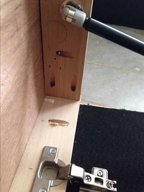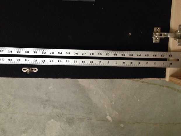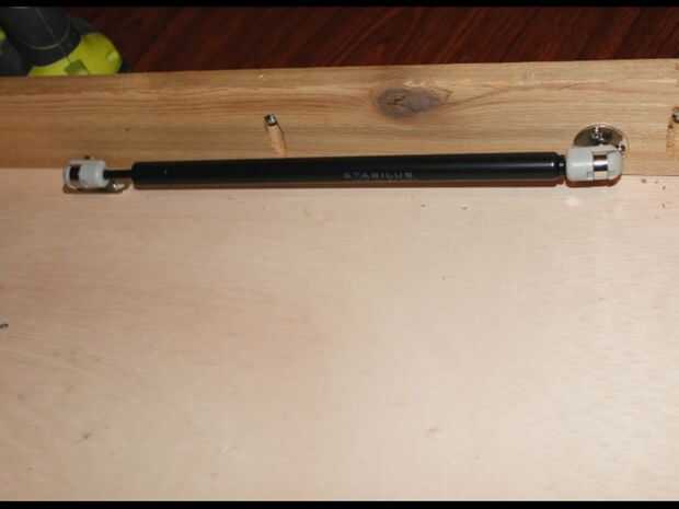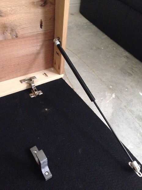 El soporte de bola angulado de metal va a ser tornillo atornillado al tablero de 18 en desde la parte superior del tablero y al menos 1 1/2 de distancia al final por lo que da la separación del marco para cerrar correctamente. El soporte de la bola de metal recto se atornillarán 6 pulgadas desde la parte superior del interior marco de la cara. Repetir lo mismo para el lado opuesto. Una vez terminados ambos lados, instalar ambos de los amortiguadores a gas y prueba a ver si funciona correctamente. Si se produce el obligatoria ajuste hasta que funciona correctamente. Una vez que puede cerrar sin problemas, continuar al paso siguiente.
