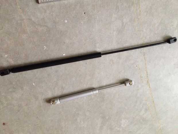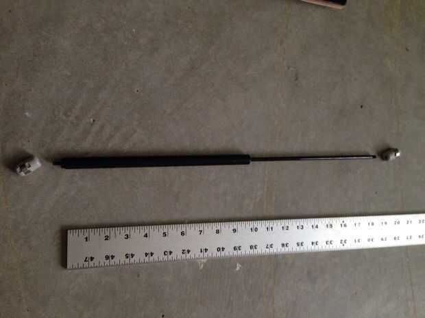 Empecé por la compra de los amortiguadores a gas de Ebay. Originalmente compré dos 22 Lb fuerza 90mm Stroke Lift apoyo Struts resorte de Gas de ebay por unos $7.00. Entonces se dio cuenta después de que instalé, no tienen la capacidad de levantar el peso de la madera frontal. Así que tuve que sentarse ad repensar sobre lo que iba a hacer. No quiero renunciar a este proyecto en este punto. Así que pensé por un rato y luego la bombilla en mi cabeza vino en. Puedo conseguir unos amortiguadores a gas tamaño bastante decente de la yarda de la chatarra de verdad baratos. Si esos choques pueden levantar un capó de coche puede definitivamente Levante la madera para mi proyecto. Terminé usando el hardware de los choques de Ebay y usando en los golpes de gas desde el depósito de chatarra para que funcione. Combiné los extremos de la gris pequeño sorprendió a los choques negro debido al diverso tamaño de la bola de metal que pivotea en. Estas piezas de montaje metálico que vinieron con los choques EBAY se instalará en el tablero y marco de madera.