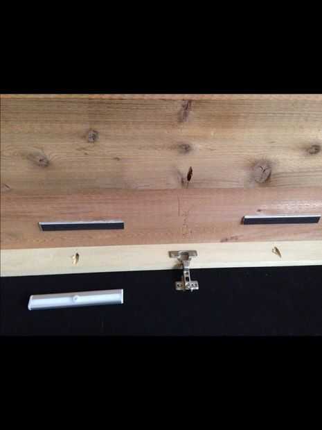 He comprado dos sensor de movimiento LEDs de Amazon por unos $15 cada uno. Enciende automáticamente cuando no detecta ninguna luz, pero con el movimiento se activa automáticamente. Necesito hacer un soporte para montarlo, porque estos LED de venir con un forro adhesivo imán en el lado opuesto de la misma. La parte posterior pegajosa no pega del lado áspero de la Junta Directiva de cedro. Por lo tanto, lo que hice es cortar un trozo de tira de aluminio de raspar abajo del mismo tamaño que el LED, los hizo dos agujeros en cada extremo con un taladro. Después de cortar y perforar los agujeros de ambos soportes, luego atornillar ambos en el interior de la cara. Retire el soporte de la parte de la etiqueta engomada de la tira magnética y el lugar en el aluminio. Después de eso, el conjunto de luz de LED con acople al imán.