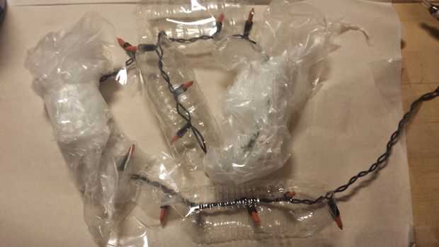 Abrir las botellas de agua con su cuchilla de utilidad y ejecutar la cadena de luces a través de ellos, también puede utilizar lonas barato piso plástico y sábanas.