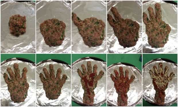 5. para el look sangriento, salpicar unas salsa de tomate en él y extenderlo con los dedos.