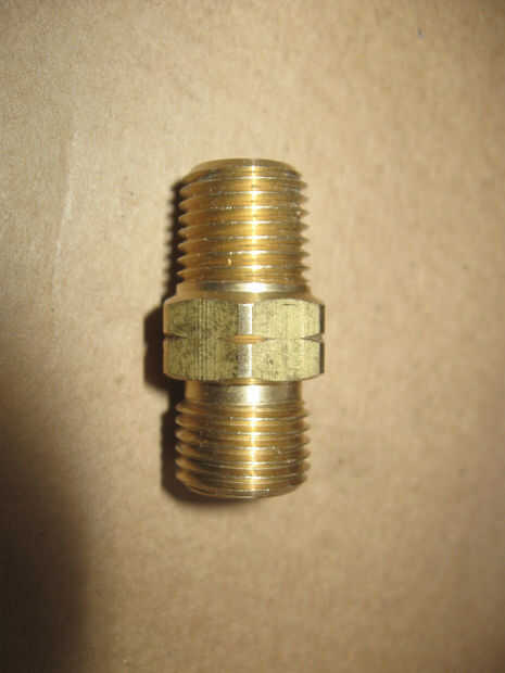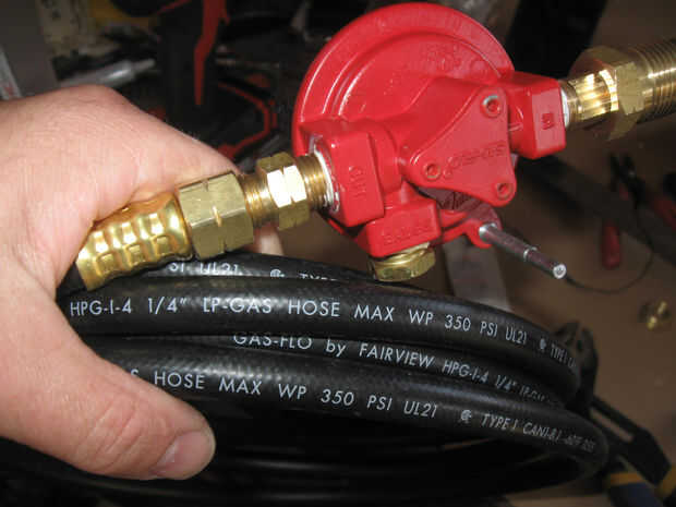El LP manguera y el regulador se conexión a la válvula mediante un reductor de cobre amarillo y Racor adaptador como se muestra.