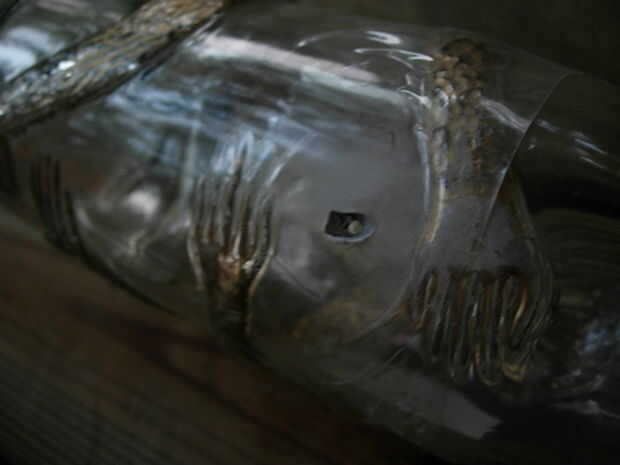 Ir a la parte más profunda de la gubia hiciste con una broca muy fina. Eventual apertura de un orificio muy pequeño que usted se completan lentamente, por lo que no quiebra la botella o causar grietas de tela de araña del agujero...