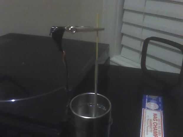 Para mi soporte de incienso utilicé un cocodrilo pequeño clip hadd ahí junto con 2 circuito negro (?) hilos. Hará cualquier pieza larga de metal semi-flexible, tuve ese tipo de colocación alrededor y era un poco fino usé 2 tiras entrelazadas. Corte el cable cerca de 7-8 pulgadas de largo o por lo menos más largas que el incienso que desea grabar. Envuelva un extremo del alambre alrededor del clip y cinta de seguridad. Usé cinta eléctrica negra porque parecía fresca pero se puede utilizar cinta adhesiva para conductos. El resto del alambre hacia el lado de la lata o la cinta. hacen exra seguro, sólo por seguridad.