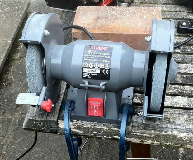 uso de la amoladora de banco puse un ligero ángulo en el metal de la soldadura ir a, cuando se juntan las 2 piezas debe darme una v buena para soldar en a.