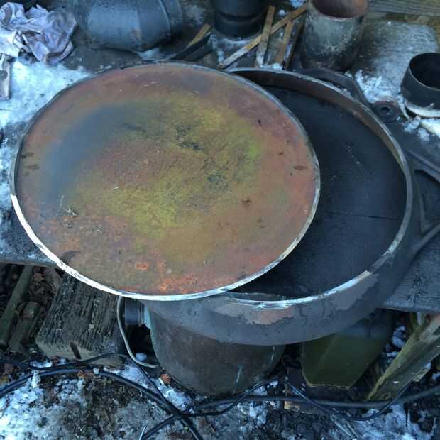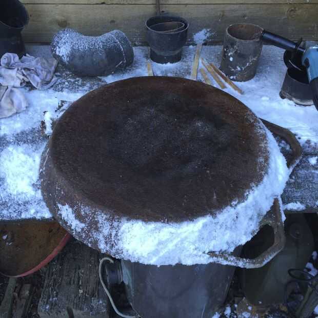 Yo tenía un montón de pensamientos sobre cómo cortar un círculo en la parte inferior de este pan viejo, (que es de hierro fundido de 12 mm!), yo sabía que el juego no lo haría, y yo no he estirado a un cortador de plasma todavía. Jugó con hacer una plantilla para la amoladora angular cortar círculos, hasta que finalmente comprendí no necesitaba cortar un círculo, sólo necesitaba cortar la llanta off (¡ DOH!), así que pegado un nuevo disco de 1,6 mm en la amoladora angular y lentamente cortar alrededor de la llanta desde el exterior, tratando de mantenerse tan cerca de la base como sea posible. Era un trabajo sucio, ruidoso, (la nieve volvió un hermoso color negro alrededor de donde estaba trabajando), pero fue bastante exitosa, sólo necesitaba hacer un poco de pulido para tidy up.