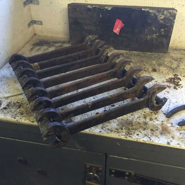 Recientemente he comprado un lote de trabajo, (algo así como 500), 1945, Ministerio de defensa, 13/16 llaves de whitworth. (Sé, impulso de comprar). Tengo muchos proyectos para ellos, pero la primera es la rejilla de mi quemador. Éstos son perfectos, son del mismo tamaño, y tuve que soldar un poco de acero chatarra a cualquiera de los extremos para unirlos todos juntos.