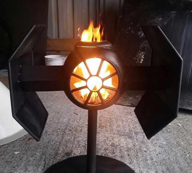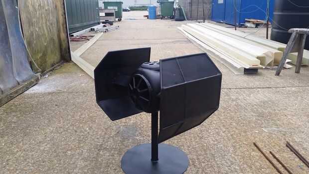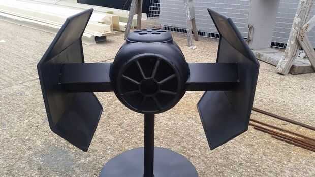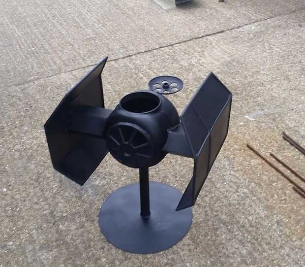 tie fighter quemador madera hecha de una botella de gas de 2.5 kg y utiliza 10mm montó para hacer frente y las alas utilizaron hoja de 0,5 mm para las alas.