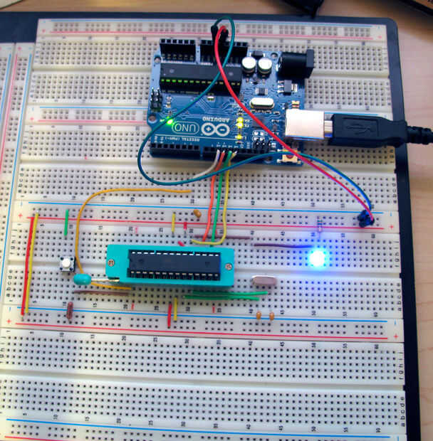 Todos los componentes de alambre como se muestra en esta imagen en la protoboard. La toma de Ziff se coloca a partir del pin 21, agregar marcas en el protoboard para mostrar el Pin 1, Pin 14, 15 Pin, Pin 28 del Atmega dip28 chip ya que es fácil conectar más tarde. La placa no muestra poder, pero poder ejecutar + 5V y GND de placa a placa Arduino.