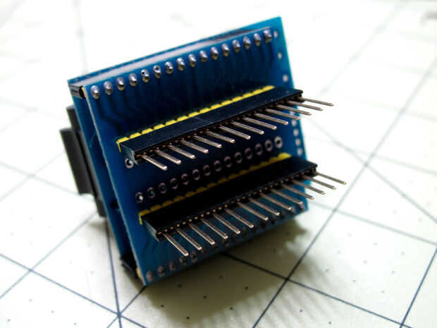 Conectan 8 pines, 6 pines como se muestra a DIP28 pernos del adaptador TQFP. Esto es para levantar en protoboard y para tener una buena vista de pines en la placa. Por favor preste especial atención a Electro descarga estática que puede dañar el chip cuando carga y eliminación de la toma. Alinee los pins del chip como se muestra en la imagen.