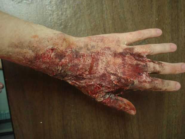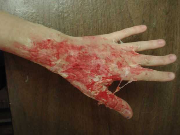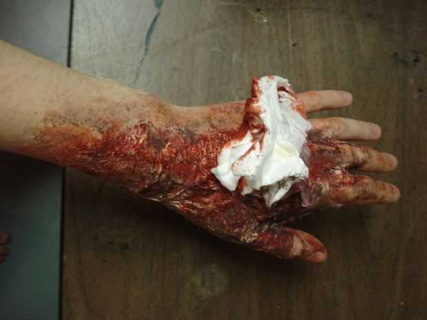 1. Vierta un poco de cada tipo de pintura en un plato. Utilizando algunas alagodón encima de papel de seda, borra la pintura roja sobre la capa base. Seguimiento por borrar cualquier otra mezcla de la pintura sobre la capa base. Aquí he usado negro, rojo, marrón claro y unas gotas de sangre falsa de una tienda de disfraces.