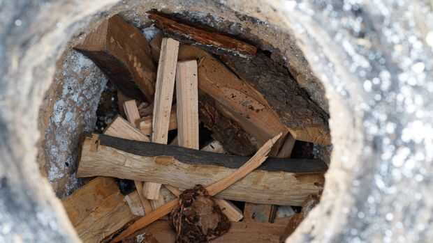 Para cargar a la vez, poner una capa en la parte inferior que es perfectamente apilados y diseñado a la luz rápidamente y el fuego se propagó rápidamente. Una cabaña de troncos entrecruzamiento diseño con un montón de pequeñas astillas y ramitas en el uso. Otras adiciones buena son la pelusa de las cabezas de semilla de caña de totora, corteza destrozada, hierba seca y tono saturado madera de árboles de coníferas. Alrededor y encima de esta poner una buena capa de madera, lo suficiente como para formar un carbón bueno cama en la parte inferior y luego agregar una capa de cáscaras. Añadir otra capa de madera con algo de combustible grande y algunas pequeña, luego más conchas. Continuar con capas, manteniendo la proporción 1:3 de cáscaras en la madera hasta dentro de aproximadamente 6 pulgadas de la parte superior, tapa con una buena capa de madera. La última capa de madera puede ser mounded sobre la parte superior del horno de tal manera que caerá en el contenido quema y fregadero. Si bien preparado tu fuego base, debería ser fácil encender el fuego, pero quizás tenga que hacer algún tipo de pequeña antorcha o algo para poder empujar en uno de los orificios de ventilación. Si es a la luz vacilante, inserte un pegote de la quema de brea de pino.