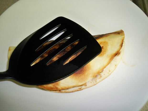 Poner en un plato y doblar inmediatamente. Utilice una espátula y precaución. La quesadilla es loco caliente.