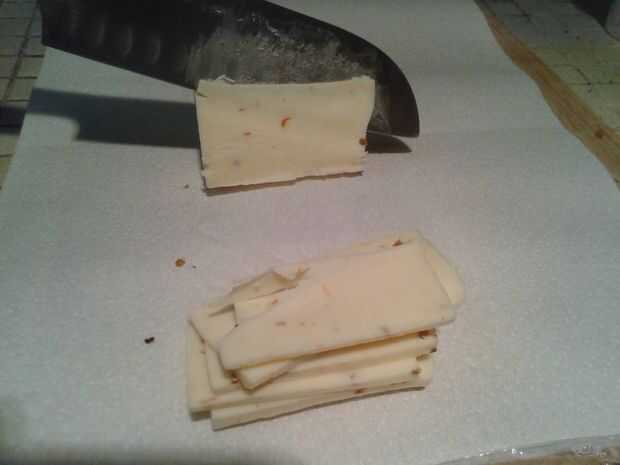 Esto es la obra más que vas a hacer para la comida entera. Simplemente rebanar el queso tan fina como quieras mientras tu pan calienta para arriba con la primera tortilla en ella.