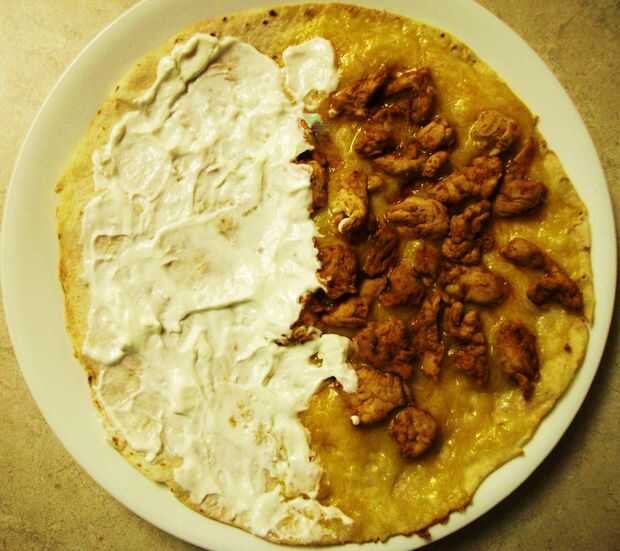 En el lado izquierdo de la tortilla (el lado sin el queso y pollo) uniformemente repartidos de 1/4 taza de crema agria.
