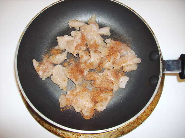 Coloque su sartén antiadherente sobre la estufa. Ajuste la temperatura a medio-alto. Después de un minuto o dos, tu pan estará caliente y listo, es hora de cocinar el pollo. Vierta lentamente el pollo picado en la sartén, junto con aproximadamente una cucharada de condimento en el pollo de taco por aspersión.