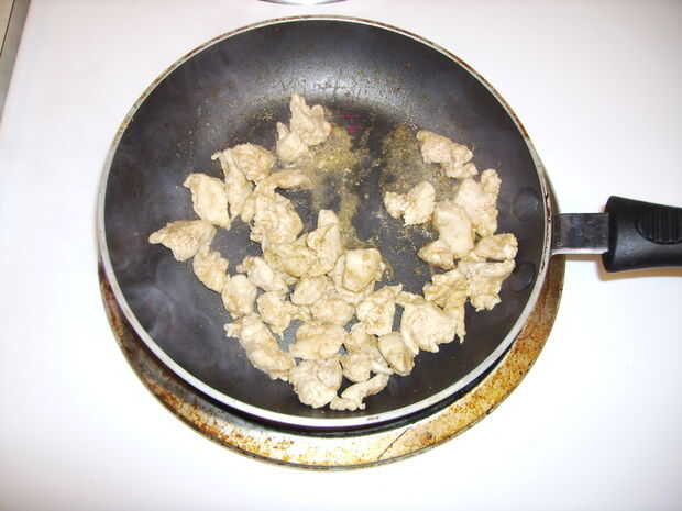 Continuar revolviendo el pollo para evitar que se peguen a la sartén. (Si el pollo comienza a pegarse a la sartén agregue 1/4 de taza de agua) Cocine el pollo hasta que esté dorado, este se suele tomar 6-7 minutos. Para ver si se hace el pollo, cortar el más grande por la mitad para asegurarse de que ha sido cocinado completamente. El pollo será el mismo color a lo largo de toda la pieza con ningún color de rosa en el centro. Si hay todavía rosada en el centro, continuar la cocción hasta que no hay queda rosa. Cuando acabada Retire la sartén y apagar la estufa.