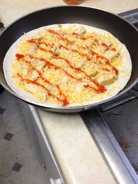 La parte inferior de la tortilla de mantequilla, meter en la sartén y agregue el pollo, queso, salsa de búfalo