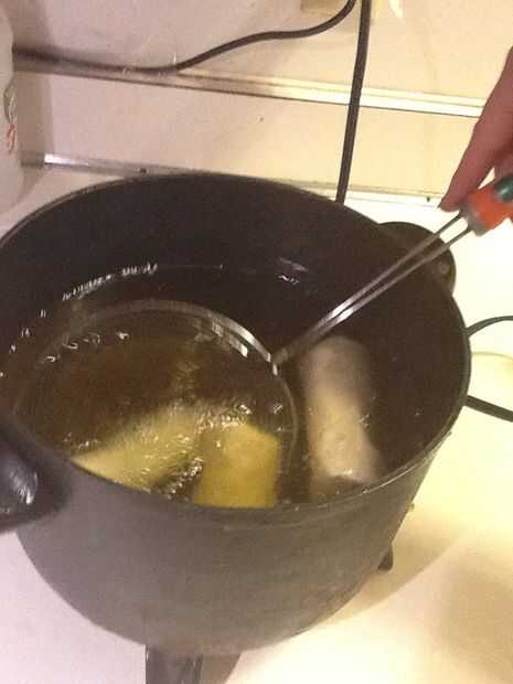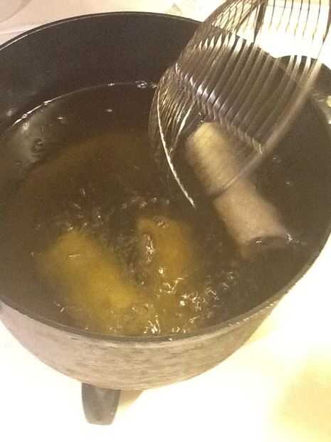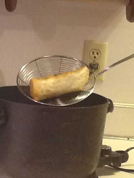 De la gota 3 o 4 rollitos de primavera en la freidora en un momento. Asegúrese de mover todo un poco y voltearlas. Que están hecho cuando ellos son luz dorada y crujiente. Cuidadosamente retirar y colocar sobre una placa forrada con papel de cocina para absorber la grasa. Cocinar como muchos rollos frescos como usted puede comer y congelar el resto para más adelante.